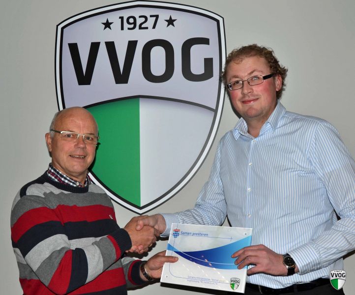 Op de foto ziet u hoe de bijbehorende plaquette wordt overhandigd door Ben ten Brake namens PEC Zwolle aan Klaas uit de Bosch vice voorzitter van de jeugdcommissie van VVOG.