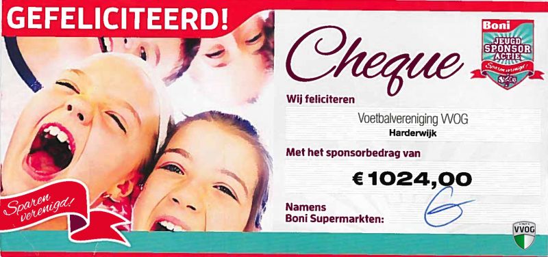 De Boni in Harderwijk bedacht een actie waarbij iedereen die daar voor € 10,00 of meer boodschappen kocht een munt kon doneren aan plaatselijke sportverenigingen. In totaal deden 8 verenigingen mee. VVOG eindigde met 16.116 gedoneerde munten op de tweede plaats net achter scouting Ragay Redoz die eerste werd. Omgerekend waren die munten goed voor een extra sponsorbedrag van € 1.024 en dat kunnen we in deze tijd natuurlijk heel goed gebruiken.