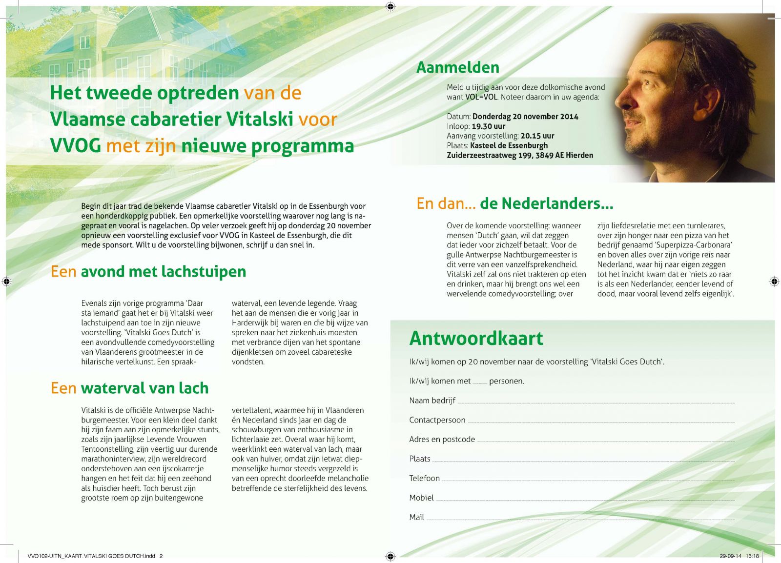 Op veler verzoek van de leden haalt de Businessclub van VVOG de bekende Vlaamse cabaretier Vitalski naar Nederland. Op donderdag 20 november staat hij weer op de planken in kasteel De Essenburgh te Hierden met de Nederlandse première van zijn nieuw show: Vitalski Goes Dutch.