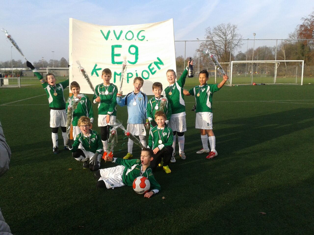 Bij winst zou de E9 zeker zijn van het kampioenschap. En dat is gelukt. Met maar liefst 15-0 werd rode lantaarndrager NSC aan de kant gezet. De directe concurrent VVOP verloor de laatste wedstrijd tegen de nummer drie van de ranglijst Stroe. Zo eindigde de competitie met een verschil van 4 punten tussen de de kanpioen VVOG E9 en de runner-up VVOP E4.