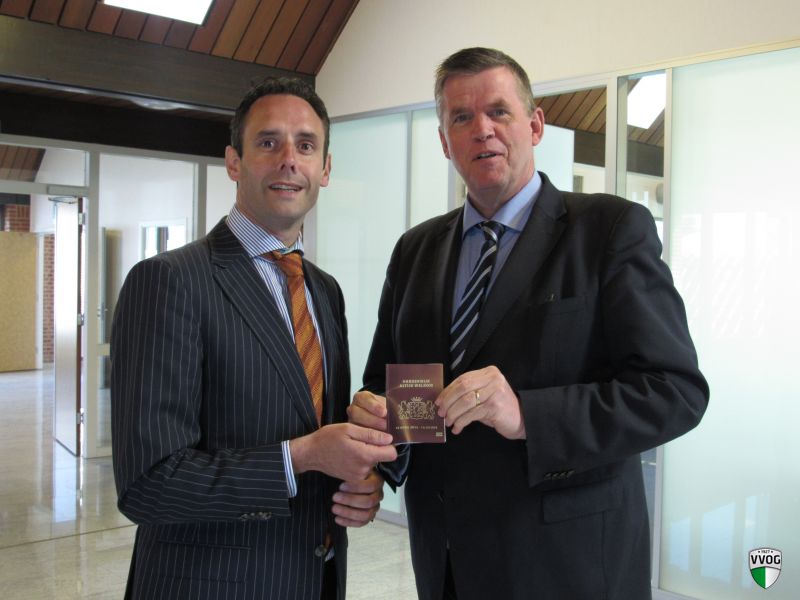 Op onderstaande foto ziet u de verrassingsaanval van Burgemeester Harm Jan van Schak over links. Met een scherpe en meesterlijke voorzet overhandigt hij het Harderwijker Paspoort (een initiatief van DVS'33 sponsor Drukkerij Wedding en VVOG sponsor Broad Communications) aan de laconiek ogende Burgemeester André Baars die schijnbaar deze aanval moeiteloos weet te pareren. (de foto's zijn beschikbaar gesteld door www.ermelovannu.nl waarvoor dank)