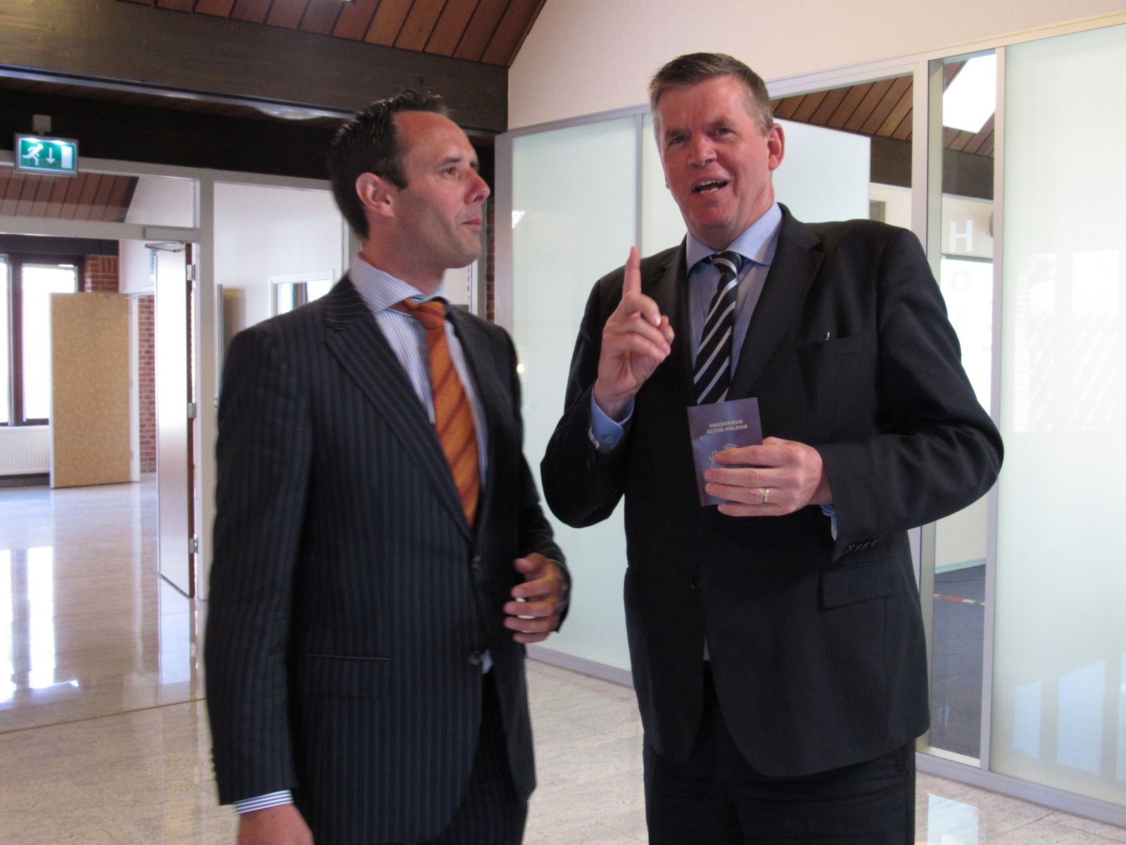 Op de volgende foto fluistert Harm Jan van Schaik kennelijk een mop om Burgemeester André Baars af te leiden. Dat lijkt een geslaagde actie.