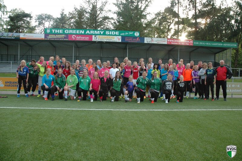 Om 18:45 werden de meisjes in de kantine toegesproken door de Jeugdcommissie. Na een korte uitleg gingen alle meiden het veld op waar de dames van VVOG 1 ze op stonden te wachten en konden de ouders met een bakje koffie in de hand langs het veld de meiden in actie zien.