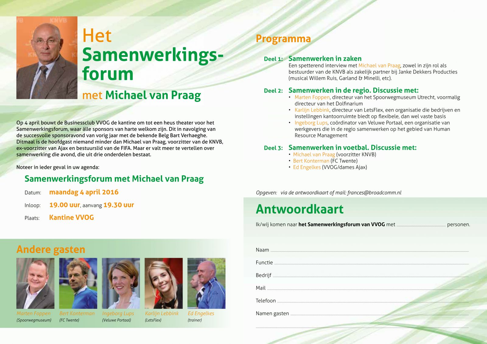 Het VVOG Samenwerkingscollege met niemand minder dan Michael van Praag, voormalig Dolfinarium maar nu begeesterd directeur van het Nationaal Spoorwegmuseum Marten Foppen en met inspirerende sprekers als Karlijn Lebbink (Letsflex) Ingeborg Lups (Veluwe Portaal) en de voetbaladepten Bert Konterman en Ed Engelkes.