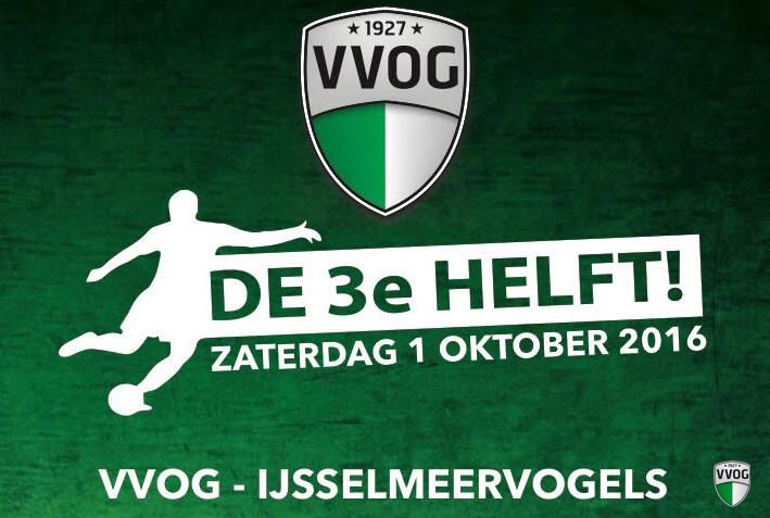 De wedstrijd zal aanvangen om 14.30 uur. Wij willen jullie allemaal van harte uitnodigen om de primeur mee te maken van de voor VVOG nieuwe “De Derde Helft”. Na het laatste fluitsignaal zal het feest in de kantine losbarsten onder leiding van 2 echte feestartiesten. De kantine zal tijdens “De Derde Helft” openblijven tot 21.00 uur. We rekenen op jullie aanwezigheid ! De toegang is gratis.