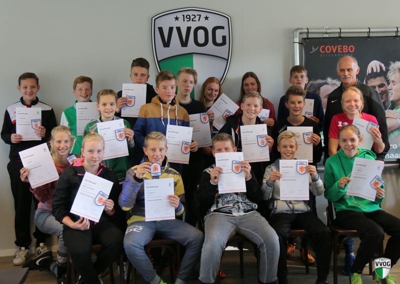 En dan natuurlijk: de theorie is leuk, maar de praktijk is anders! Dankzij een aantal spelers uit onze E en F teams met hun begeleiders die ’s middags aanwezig waren –waarvoor wij ze allemaal heel hartelijk bedanken!- konden de cursisten het geleerde in de praktijk brengen. Na het praktijk gedeelte werden de wedstrijden nog even nabesproken, en mochten de 7 dames en 11 heren hun welverdiende certificaat met de bijbehorende badge in ontvangst nemen.