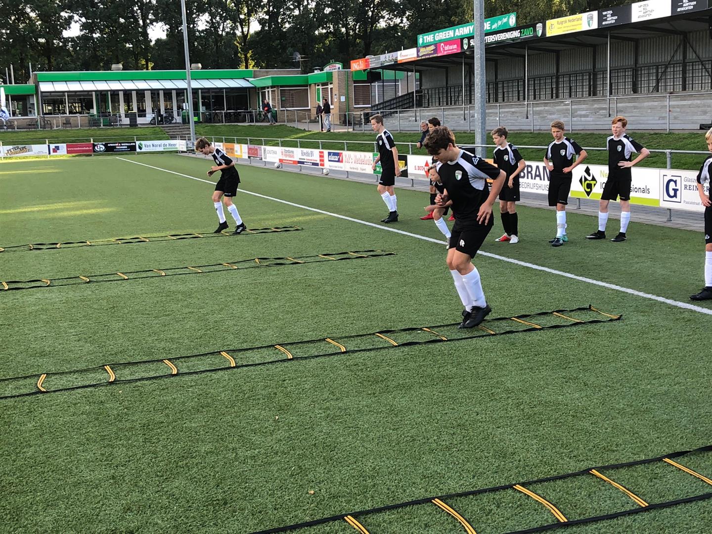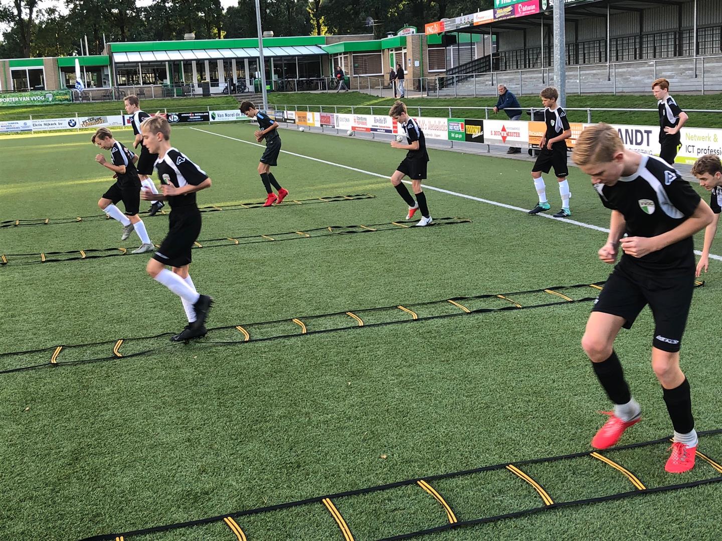 De tijden van de techniek- en looptraining op veld 1 zijn: