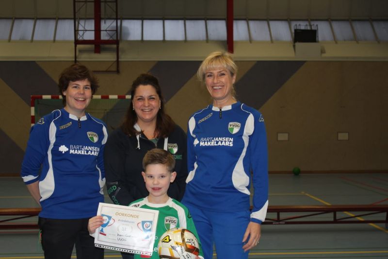 Deze kanjer heeft maar liefst 52 loten verkocht waardoor hij de beste lotenverkoper van Voetbalschool Dolfijn is geworden. Koen heeft een voetbal met handtekeningen van het eerste elftal mogen ontvangen en een oorkonde. Voorafgaand aan de zaaltraining vandaag kreeg hij deze prijs door Leila van het Grote Clubactieteam uitgereikt.