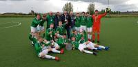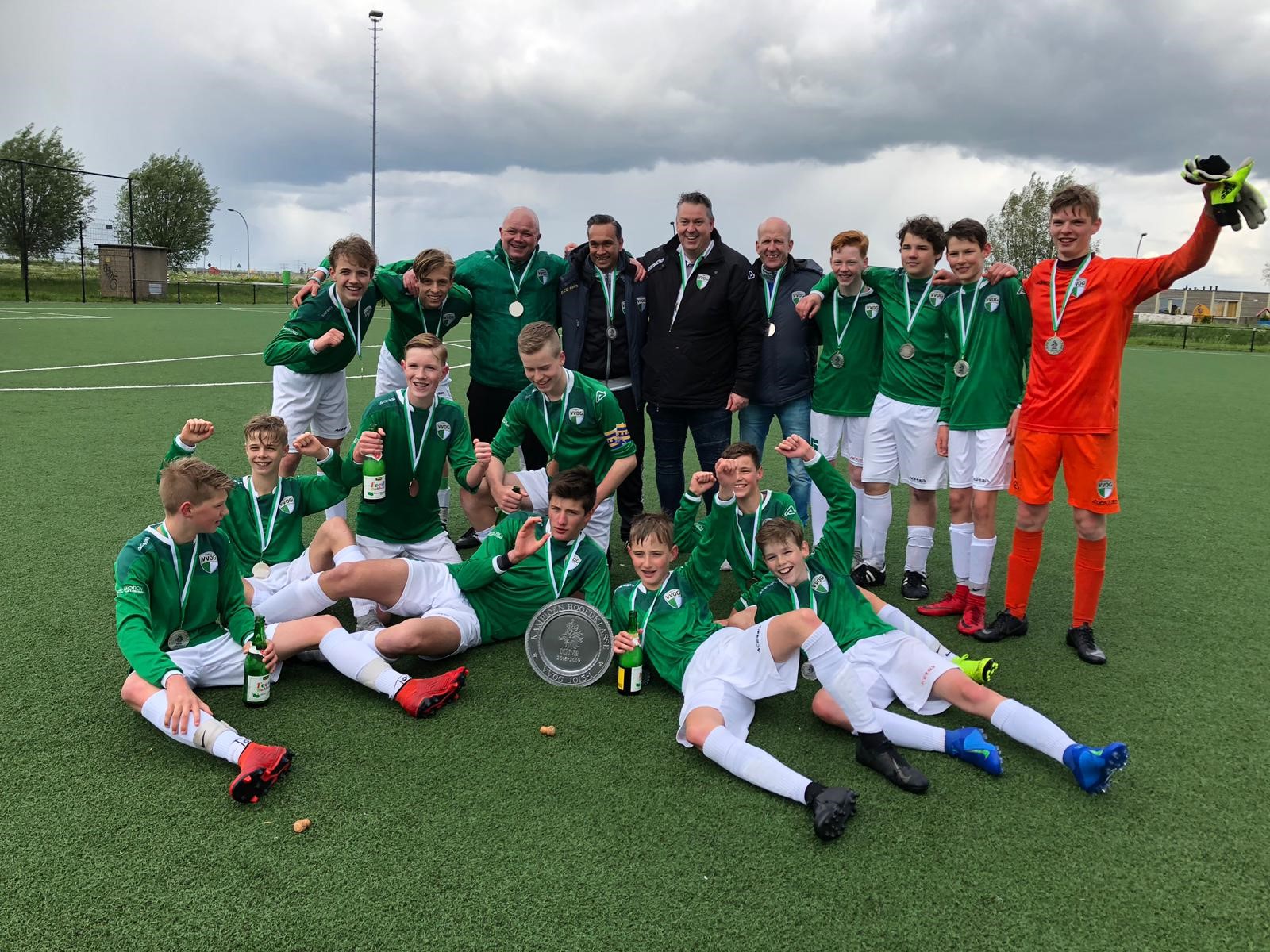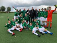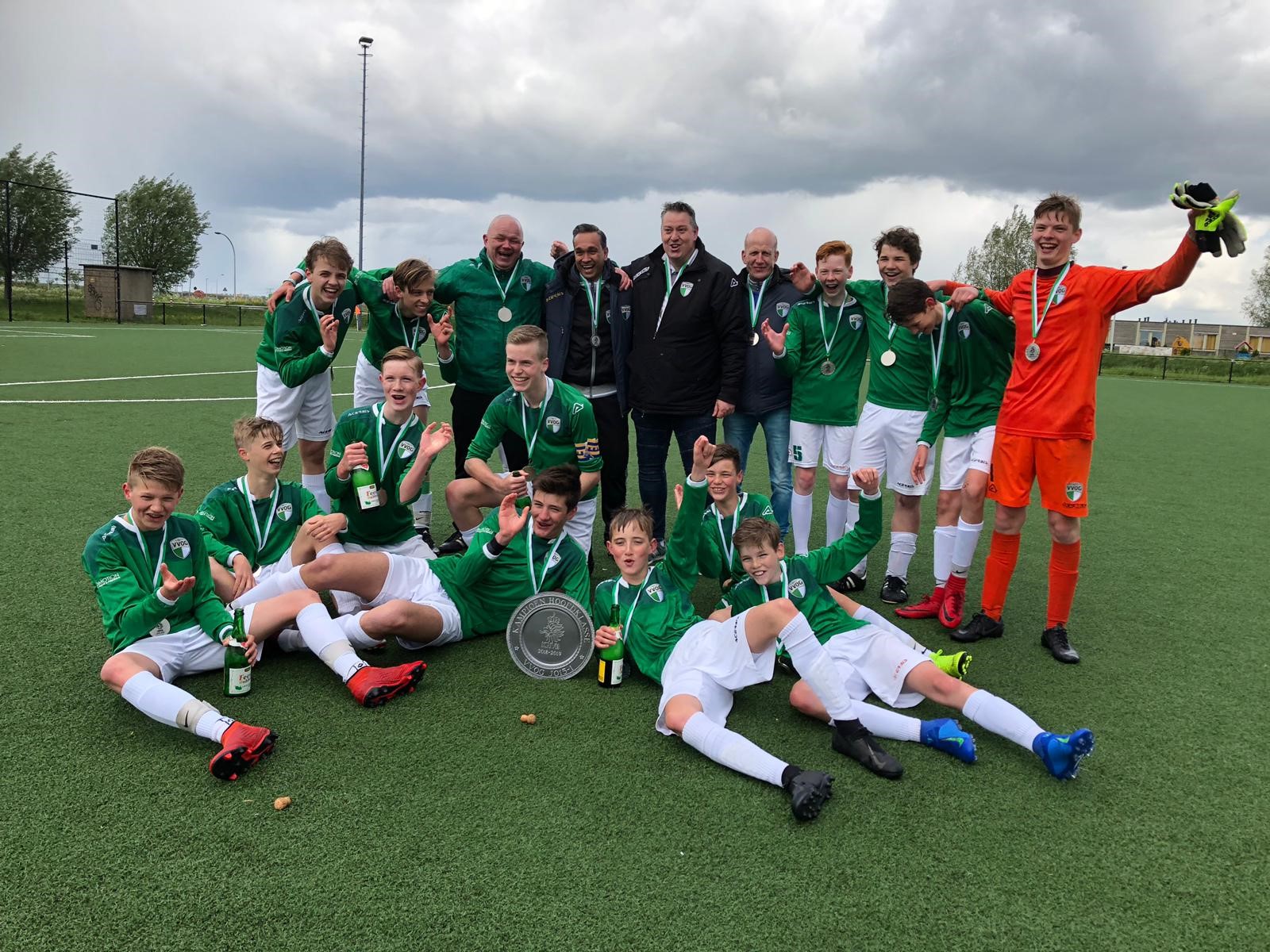 We werden op het veld gehuldigd en de welbekende schaal, de medailles, kampioenshirts werden uitgereikt (sponsors bedankt!) en de champagne (alcoholvrij natuurlijk…) spoot in het rond. Kortom een kampioenswaardige huldiging!