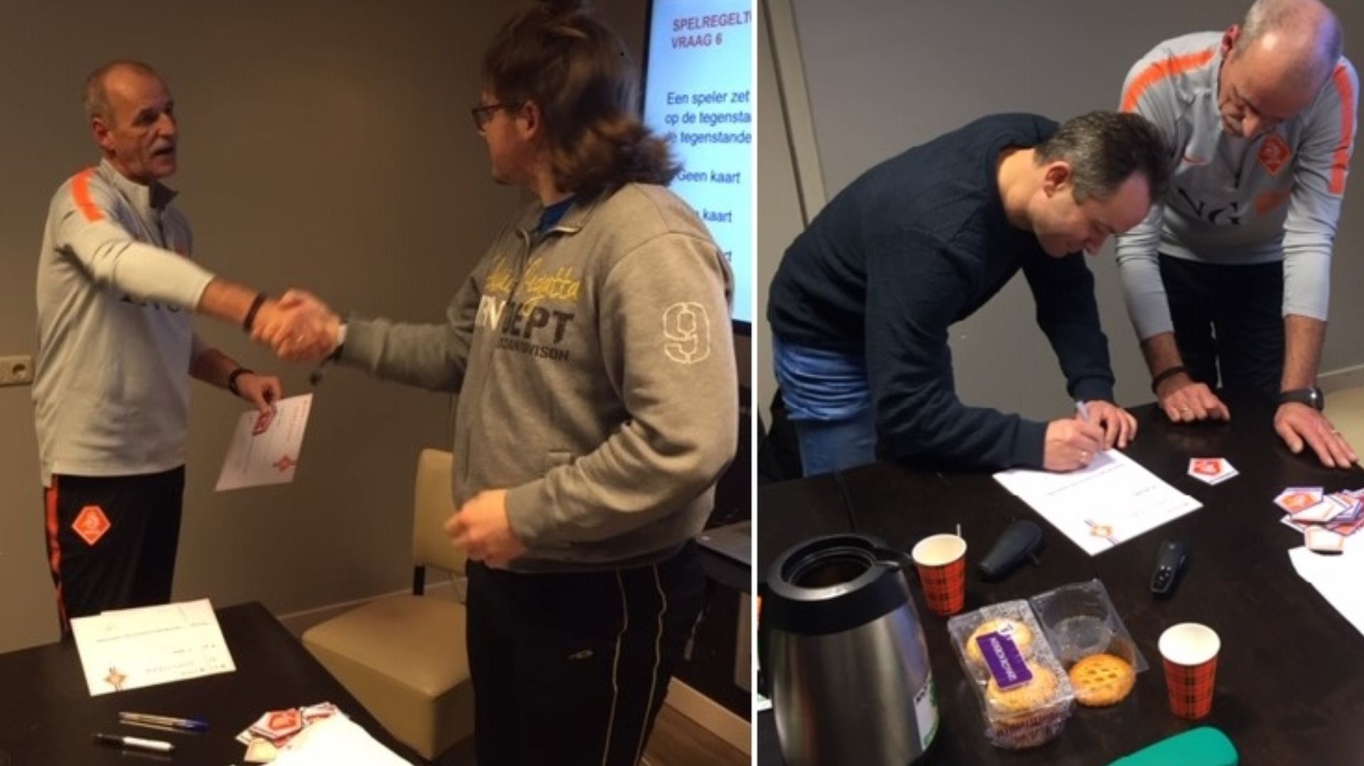 Afgelopen maandagavond hebben de heren Arjan Arlon en Arjan Kruidhof hun diploma ontvangen van de KNVB voor het goed afronden van de cursus “Clubscheidsrechter”. Afgelopen maanden hebben zij, verdeeld over verschillende avonden, de cursus gevolgd en op zaterdagen wedstrijden gefloten, die door onze eigen gecertifieerde KNVB begeleiders Frank Melkert en Jan Huijer zijn beoordeeld. Tijdens deze cursus moesten ze ook hun voortgang bijhouden via een persoonlijke KNVB pagina en uiteindelijk examen doen. Op basis van deze resultaten hebben zij een positieve beoordeling gekregen en daarvoor een diploma. Arjan en Arjan, namens de scheidsrechterscommissie van harte gefeliciteerd!!!!