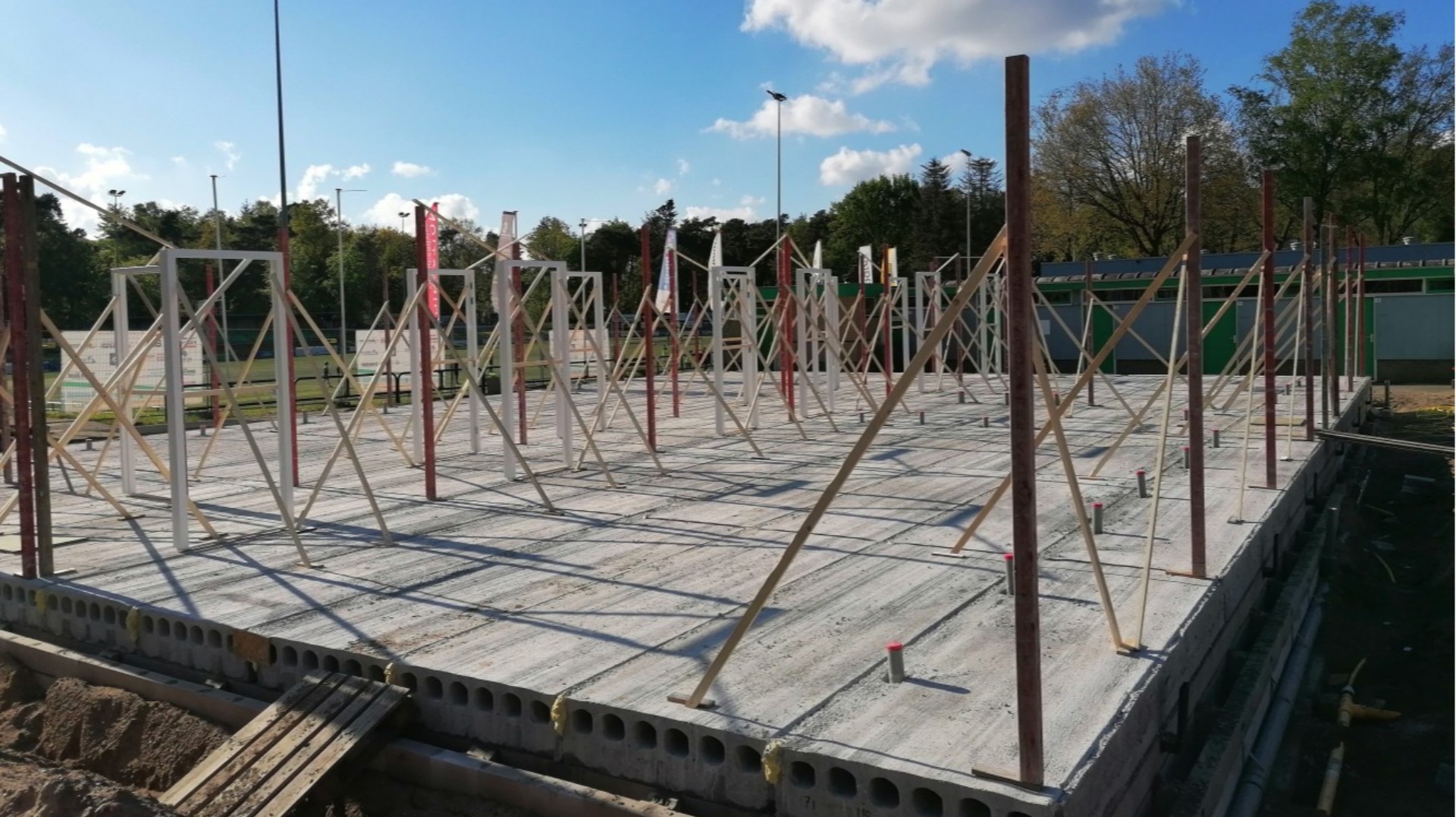 Nadat de vloer van de kleedkamers is gelegd, zijn nu ook de kozijnen van de deuren geplaatst. Je kunt al goed zien hoe het straks gaat worden. De stenen voor de wanden zijn bezorgd dus het metselwerk kan beginnen.