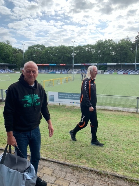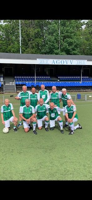 VVOG heeft een prachtige entourage, maar het stadion van AGOVV heeft nog de sfeer uit het oude profverleden. Midden in de bossen met rondom tribunes, zelf een Klaas Jan Huntelaar tribune en een houten hoofdtribune uit 1913 welke onder monumentenzorg valt. Het toernooi was supergoed georganiseerd, complimenten aan de organisatie. Het weer werkte natuurlijk ook mee. Teams hadden eigen stamtafels waar de koffie genuttigd werd en kennis gemaakt kon worden met de andere teams. Ook een bijzondere ontmoeting met scheidsrechter Ad, die we niet zullen vergeten (het moet gezegd worden Ad had een goede klik met onze Edwin en Rien). Ad ( lang wit haar tot op zijn schouders, schat toch wel midden 60) vertelde tijdens de koffie heeeel serieus dat hij een strenge scheidsrechter was en dat hebben wij geweten. Dat ging van: fluitje van AD “nr 4 lopen” en iedereen keek verbaasd ben ik dat of misschien tegenpartij. Was even wennen voor de meeste boys, maar heel consequent voor beide teams en meestal had Ad gewoon gelijk hoor. Maar ja, wij jonge honden in de wei hebben gewoon teveel energie.