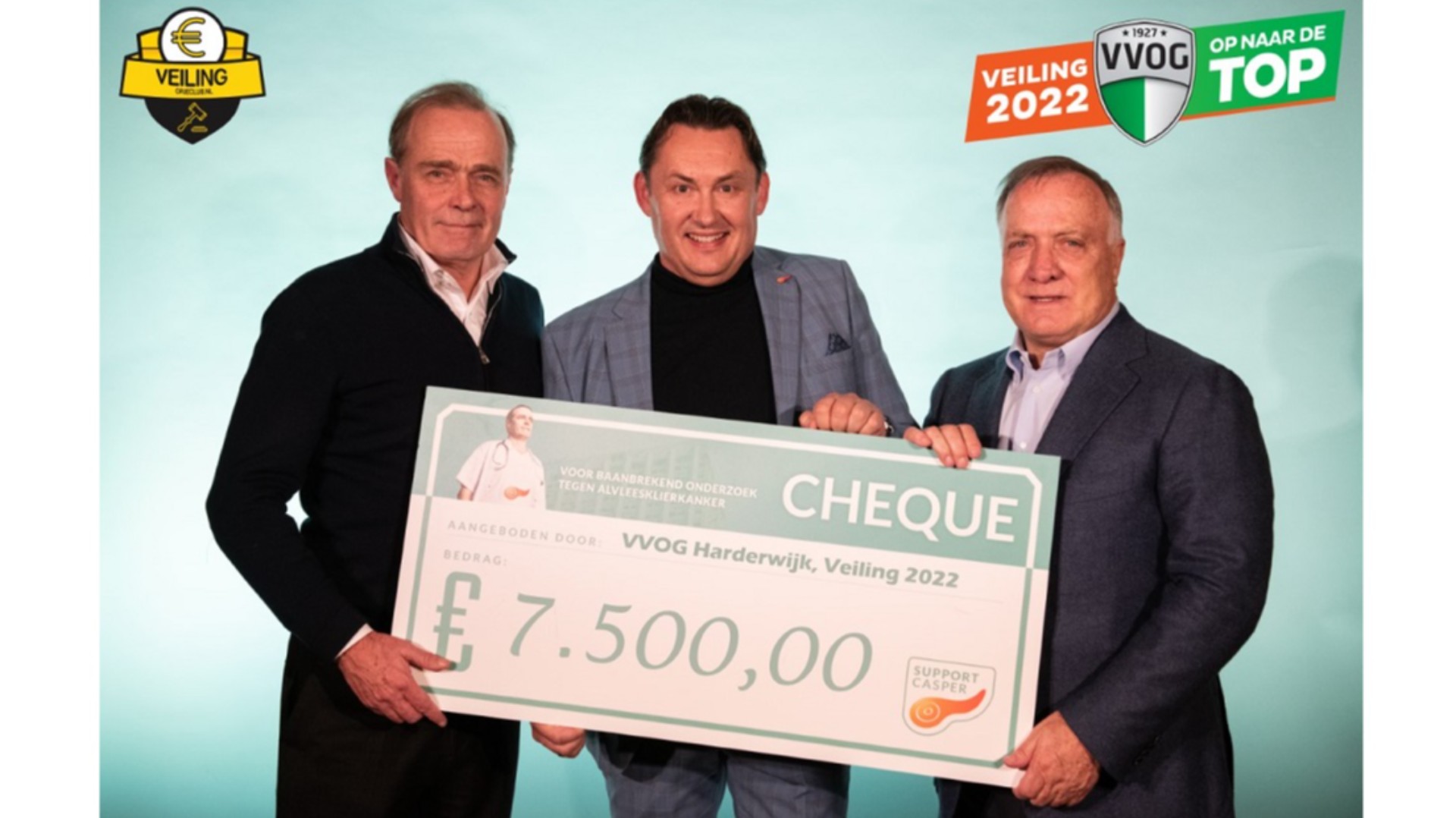 Onlangs heeft Antonio namens VVOG aan niemand minder dan de grondlegger van de stichting, Prof. dr. Casper van Eijck en ambassadeur Dick Advocaat een mooie check van