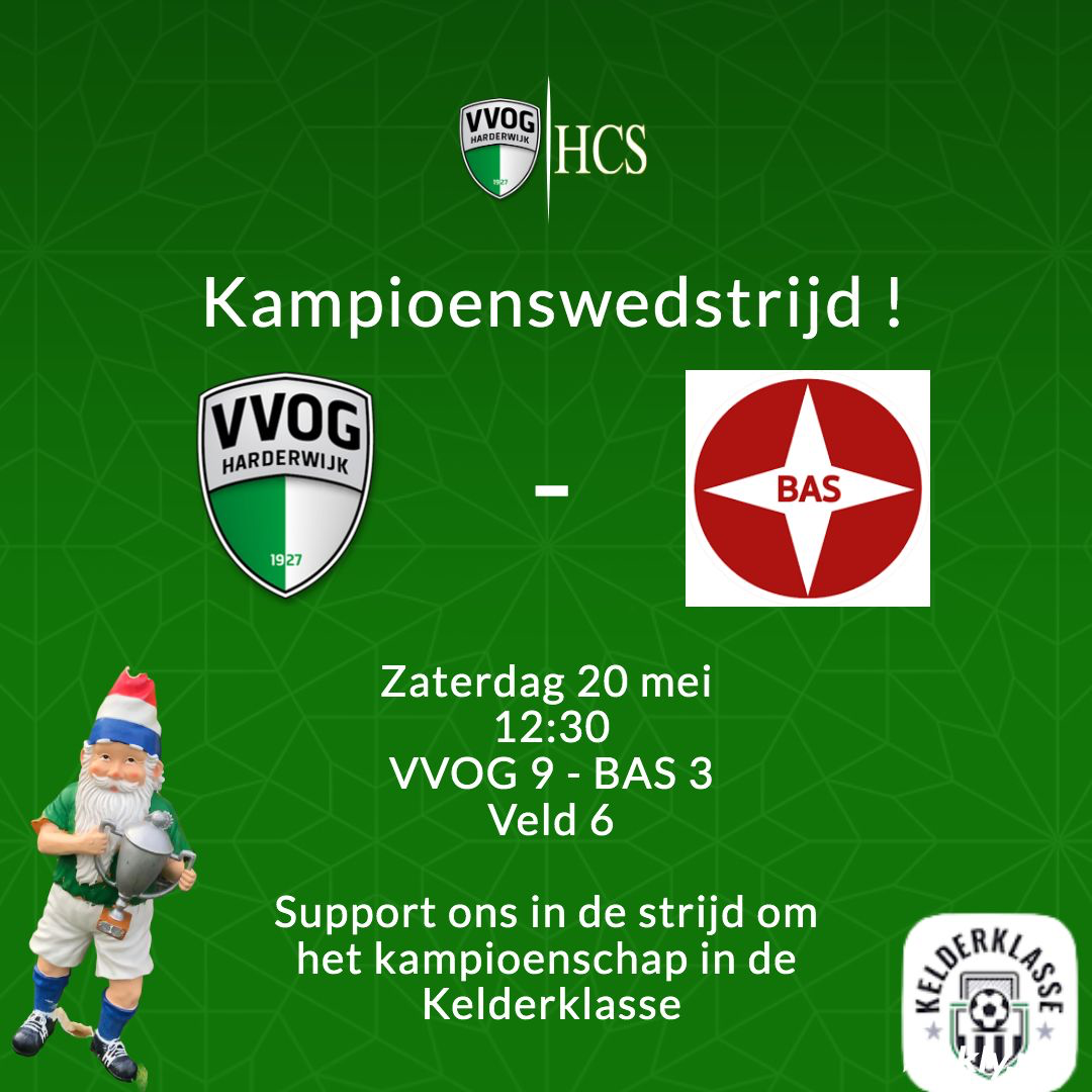 Een Kelderklasse kampioenschap is uniek en daarom vragen we zoveel mogelijk supporters om samen met ons dit moment te beleven. Na onze wedstrijd zullen we natuurlijk ook de mannen van het 1e supporten bij hun belangrijke wedstrijd tegen ACV Assen in de strijd tegen degradatie. Het 1e speelt pas om 14:30 hun wedstrijd, dus deze twee topwedstrijden zijn uitstekend te combineren en het belooft een spectaculaire voetbalmiddag te worden bij VVOG.
