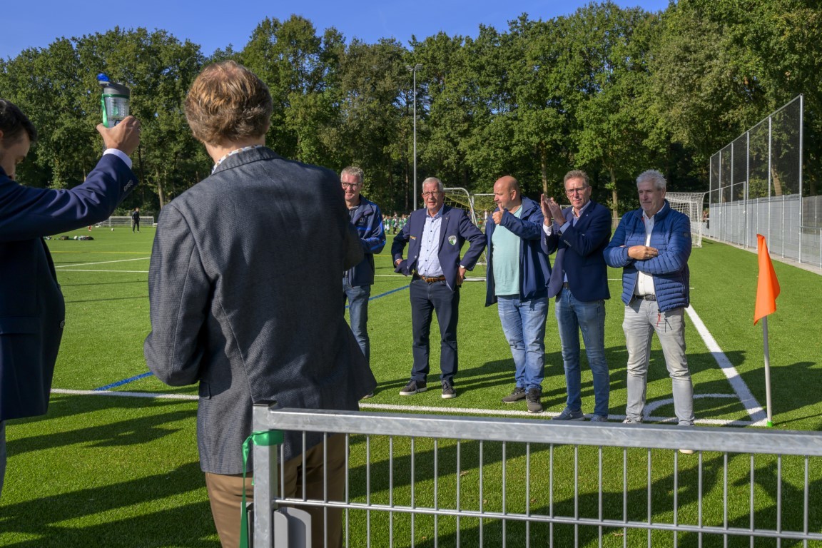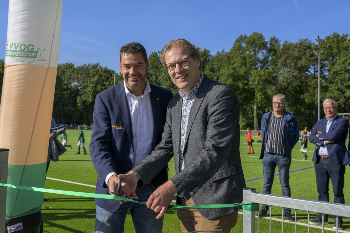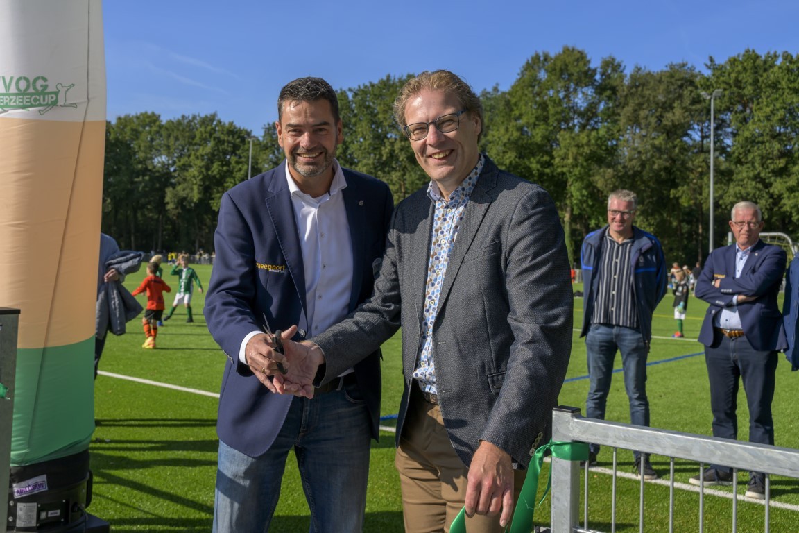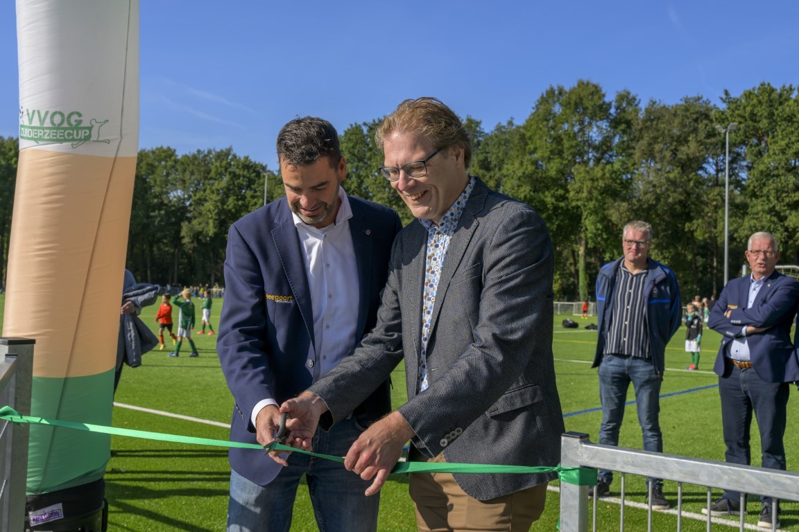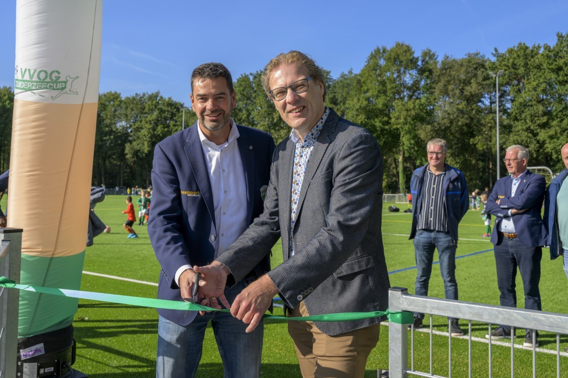 Terwijl er op drie kwartveldjes wordt gevoetbald door de jeugd, wordt het nieuwe kunstgrasveld van VVOG Harderwijk zaterdagochtend officieel geopend door voorzitter Gert Jan Krop en wethouder sport Marcel Companjen van de gemeente Harderwijk. Het lint wordt doorgeknipt en er is een toast moment.