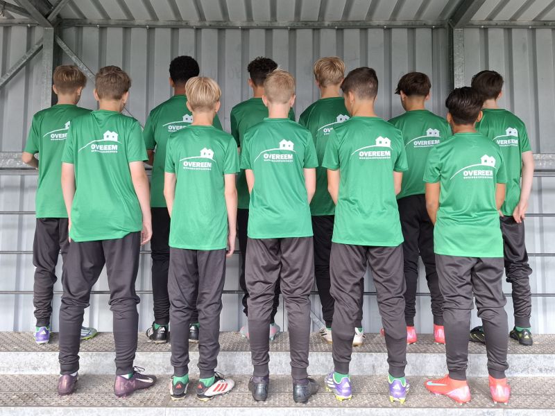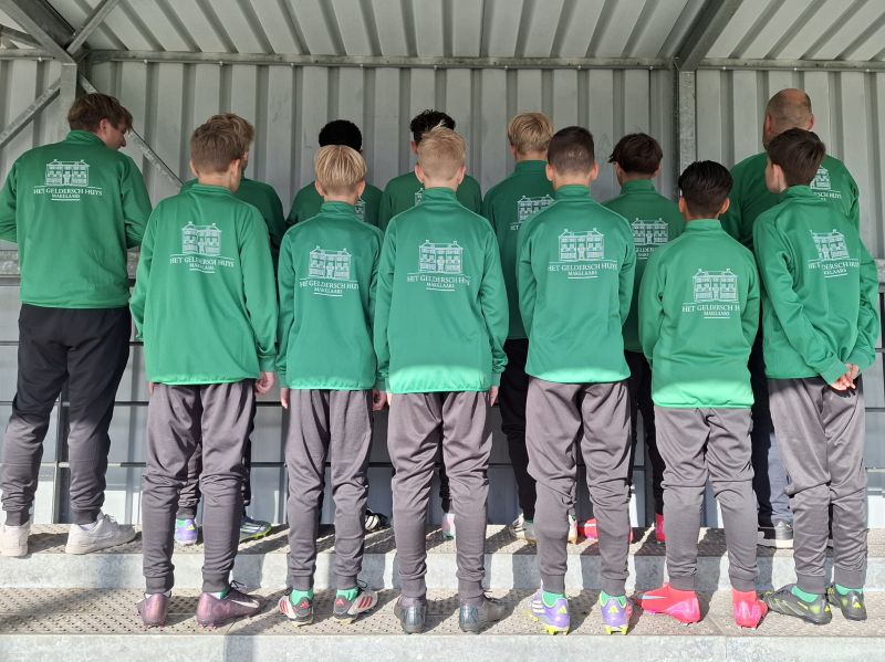 Spelers en staf zijn erg blij met de sportieve trainingspakken van Het Geldersch Huys Makelaars en mooie inloopshirtjes van Overeem Woningaanpassingen. Als ze later een huis willen kopen en woningaanpassingen willen laten doen, weten ze bij wie ze moeten zijn????.