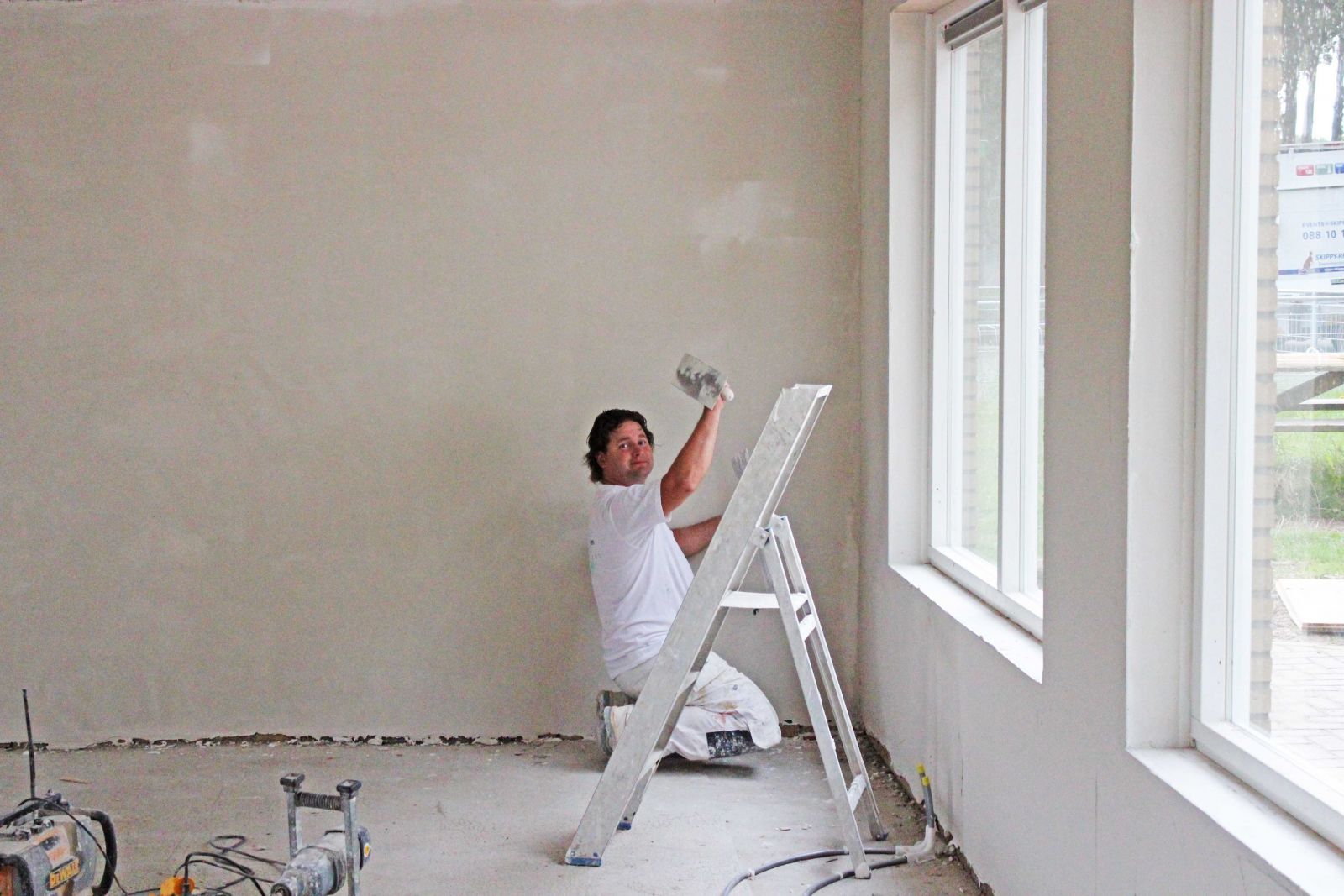 Marcel van Bijsteren (de zoon van....) legt de laatste hand aan het stucadoren van de muren. Deze week komt ook de vloer er in.