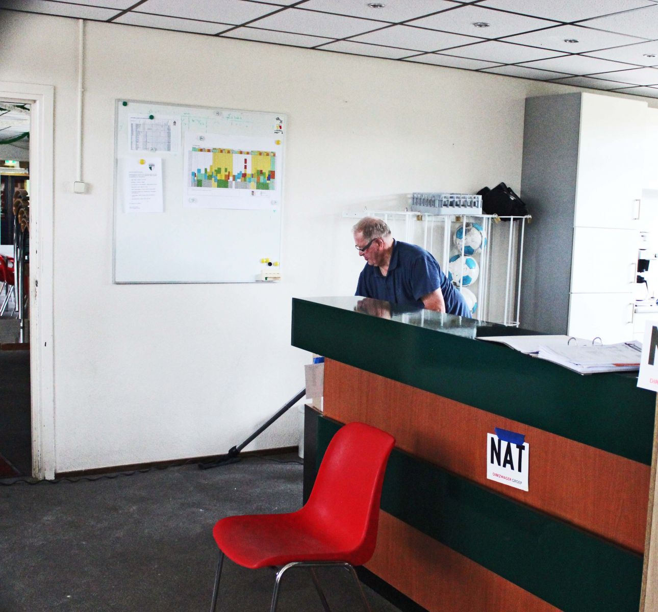 Hier de nieuwe balie voor het wedstrijdsecretariaat terwijl Barend Lubbersen (geen broer van Kees) druk in de weer is met de stofzuiger om de boel netjes te maken.
